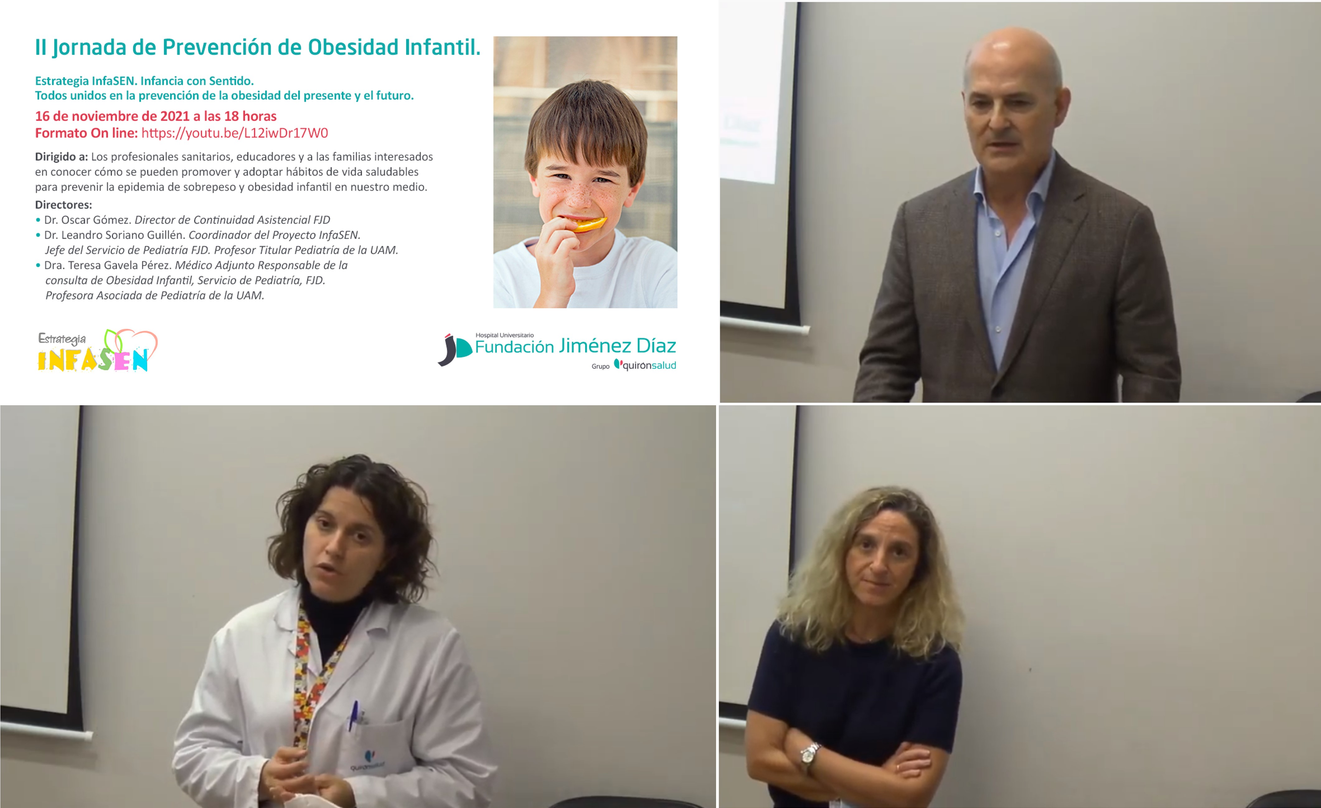 Con el objetivo de fomentar la colaboración de todos los participantes en la detección precoz y la prevención del sobrepeso y la obesidad infantil, la Fundación Jiménez Díaz ha celebrado su II Jornada de prevención de la obesidad infantil del Proyecto InfaSEN -en esta edición, en formato online y disponible para su visualizaciónEste enlace se abrirá en una ventana nueva en el canal de Youtube de Quirónsalud-, dirigida a los profesionales sanitarios, educadores y familias interesadas en promover y adoptar hábitos de vida saludables entre los más pequeños.