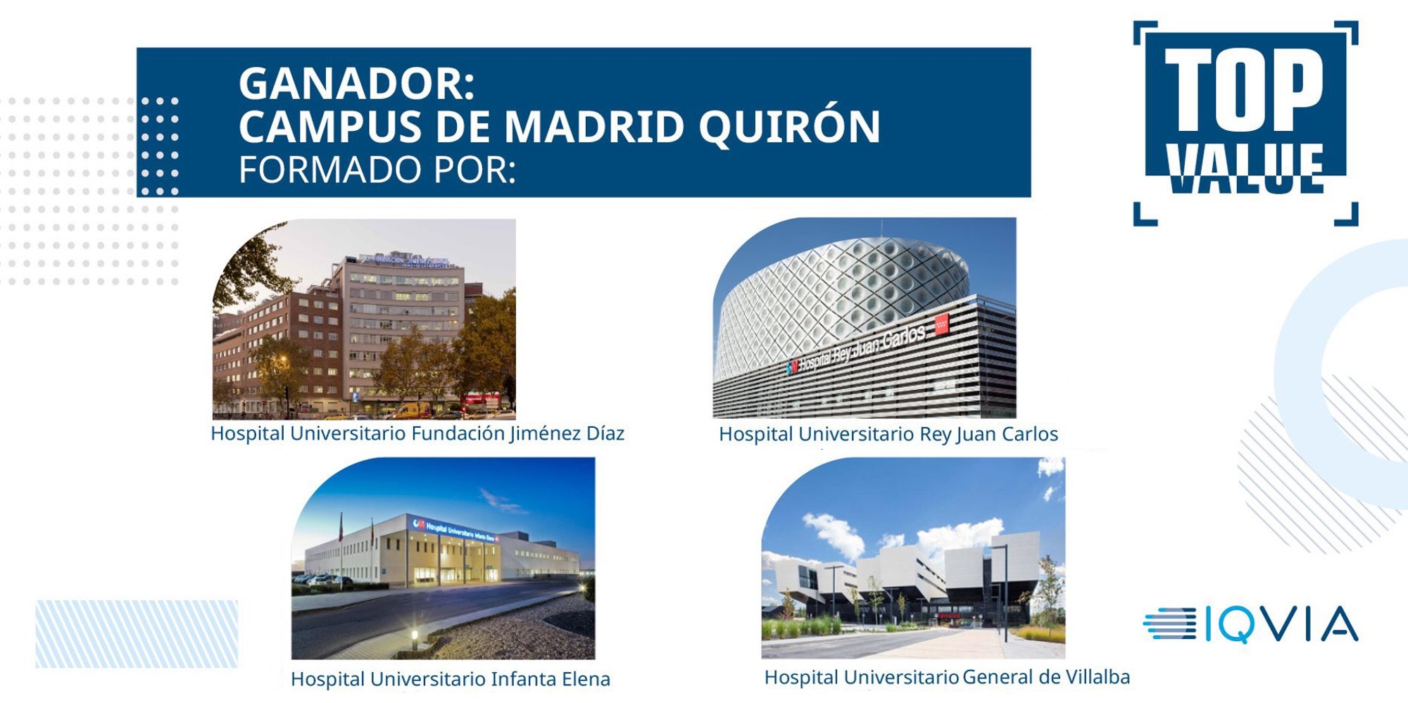 La red asistencial formada por los Hospitales Públicos gestionados por Quirónsalud en la Comunidad de Madrid -los hospitales universitarios Fundación Jiménez Díaz (Madrid), Rey Juan Carlos (Móstoles), Infanta Elena (Valdemoro) y General de Villalba (Collado Villalba)- resultó ayer ganadora de uno de los Premios Top Value, concedidos por la compañía consultora de mercados IQVIA en reconocimiento a sus resultados en actividad clínica basada en el valor.